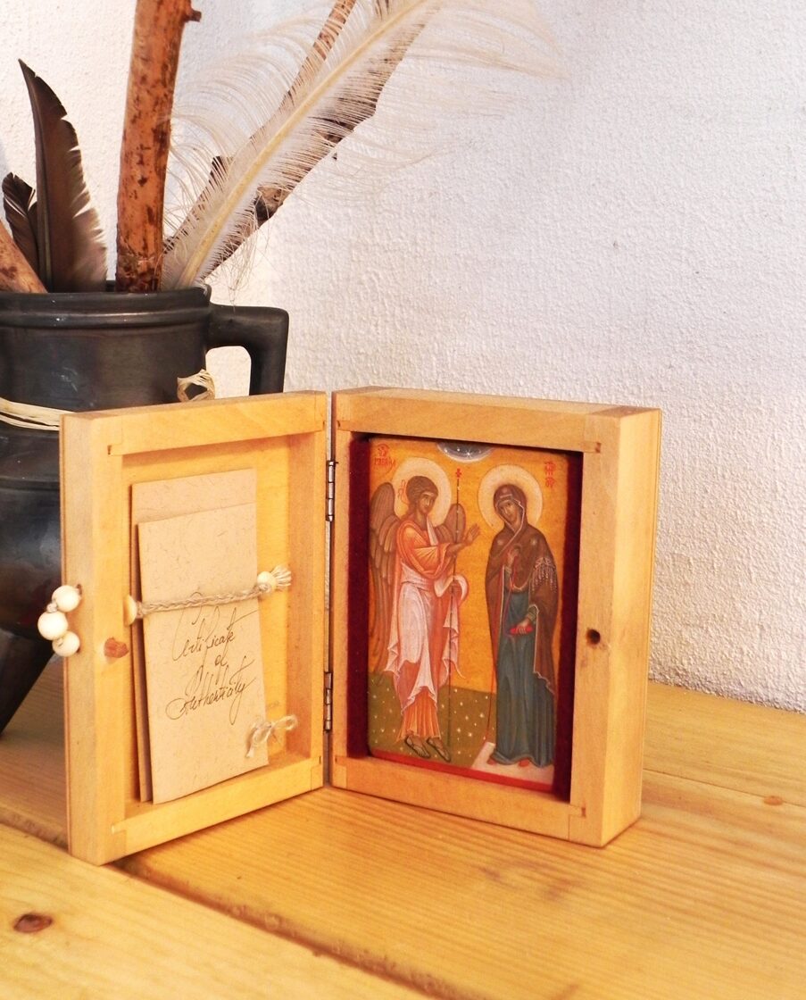 Pasludināšana, apgleznotā koka kastītē. 12x9,5x4,5cm. 2023
