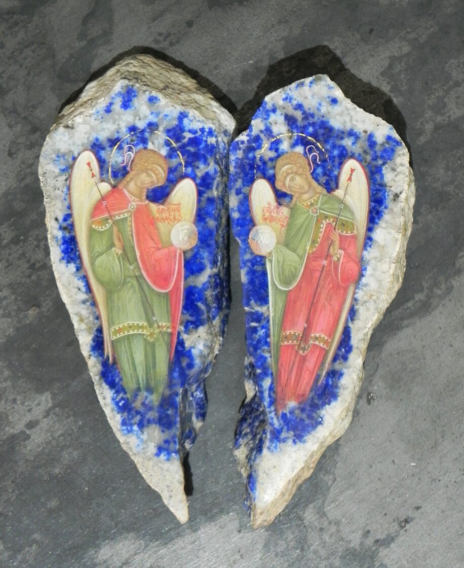 Archangel Michael and Archangel Gabriel on Lapis Lazuli stone. 16,5x13,5cm. 2025